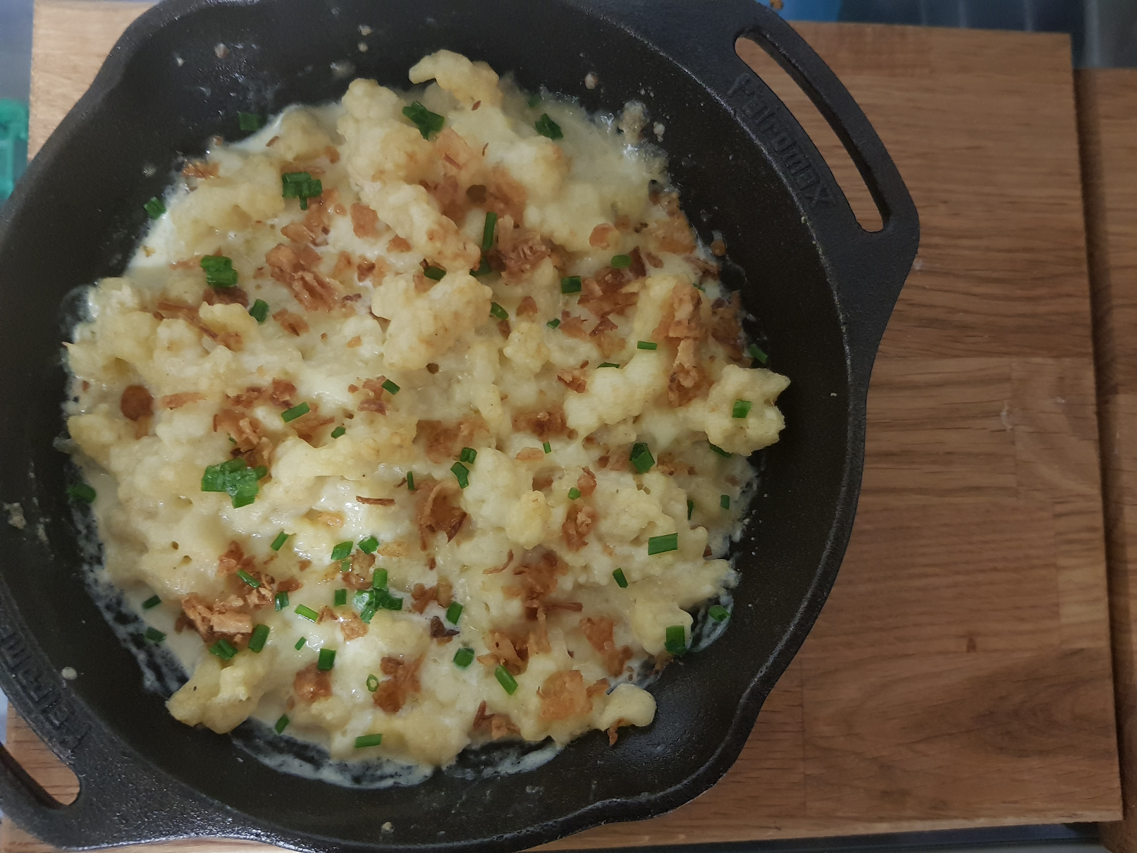 Spätzli mit Rahmsauce, Schinken, Bölle und Chnobli im Ofen überbacken